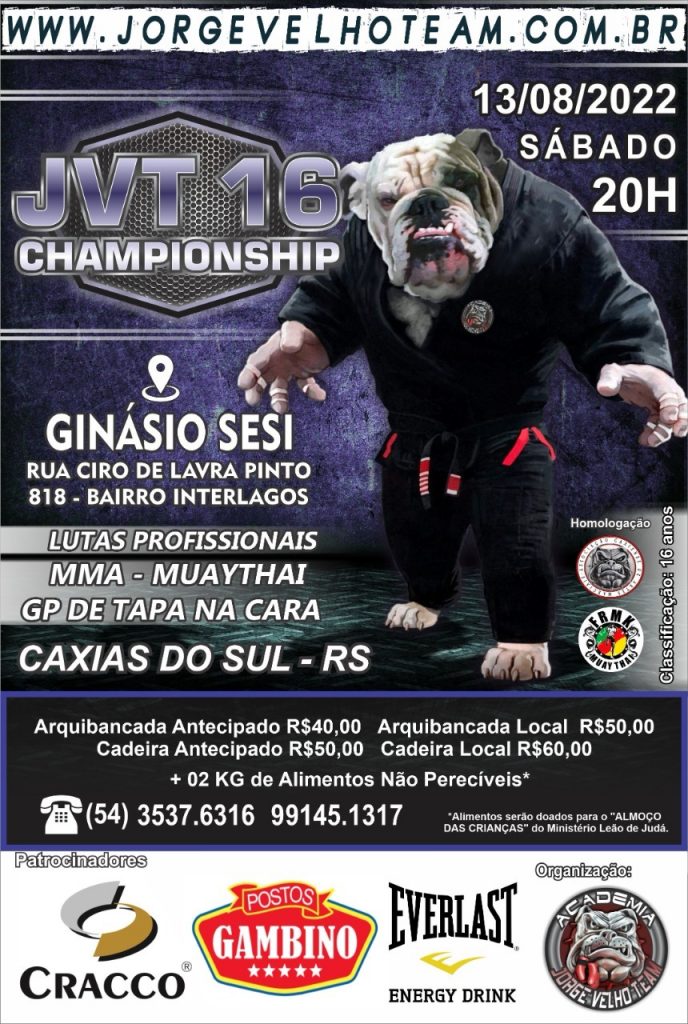 O Evento mais esperado! JVT 16 Administrador JVT 23 de junho de 2022 16º JVT CHAMPIONSHIP, NOTÍCIAS, Sem categoria Leave a comment 65 Views Share tweetRelated Articles Guarda Municipal participa de curso de nivelamento da ROMU no CT JVT9 de setembro de 2023 ⚠️⚠️PROMOÇÃO!!⚠️⚠️14 de novembro de 2025 JORGE VELHO E RECONHECIDO COMO UM DOS MAIORES LUTADORES E PROFESSORES DO RIO GRANDE DO SUL26 de setembro de 2025 Vem aí!! JVT FIGHT NIGHT 101 de setembro de 2025 Share tweet